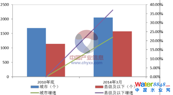 從目前污水處理規(guī)模和污水處理率來看,截止2014年3月,在設(shè)市城市中,累計(jì)建成污水處理廠2051座,形成處理能力1.26億立方米/日。在縣級(jí)及以下鄉(xiāng)鎮(zhèn),累計(jì)建成污水處理廠1571座,形成處理能力2758萬立方米/日?梢钥闯鋈珖髦饕痪城市和地級(jí)市的污水處理規(guī)模較大、污水處理率較高,未來不會(huì)有太多的大型污水處理廠(10萬噸/日以上)的新建需求,而縣城的污水處理廠數(shù)量和處理能力仍然較低,并且更多的是中小型污水處理廠,所以未來在縣級(jí)、鎮(zhèn)和鄉(xiāng)等行政單位將會(huì)有污水處理廠的新建需求,污水處理的總體規(guī)模仍然有進(jìn)一步提升的空間。