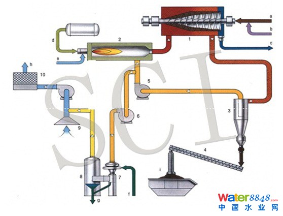 污泥(或物料)[a]經(jīng)進料系統(tǒng)被輸送到Centridry專用臥螺離心機[1]前,并與絮凝劑投配系統(tǒng)調(diào)配好的絮凝劑[b]完成絮凝作用后,一同進入專用臥螺離心機[1]內(nèi)完成固液分離,固相經(jīng)螺旋輸送器輸送至離心機出渣口,并通過特殊設(shè)計的結(jié)構(gòu)分散成松散的固體顆粒。固體顆粒在專用臥螺離心機[1]的獨有反應(yīng)罩內(nèi)與熱空氣發(fā)生系統(tǒng)[2]提供的熱空氣快速地進行熱量交換,在幾秒內(nèi)完成干燥作用,并由熱蒸汽帶出專用臥螺離心機[1],完成脫水和干燥。濾液[c]經(jīng)離心機收集罩收集后排至集水井或指定地點。干燥后的固體粉末和蒸汽(簡稱“煙氣”)一同被輸送至旋風(fēng)分離器[3]內(nèi)完成固氣分離。固體粉末通過旋風(fēng)分離器[3]下的旋轉(zhuǎn)閥門排出,并通過下部的輸送系統(tǒng)[4]輸送至指定地點。干燥后仍具有一定熱值的熱蒸汽被回收利用,通過循環(huán)風(fēng)扇[5]被輸送至熱空氣發(fā)生系統(tǒng)[2]進行再次加熱和“除臭”。多余的廢氣通過廢氣風(fēng)扇[6]被輸送至文丘里氣體凈化器(包括:文丘里除塵器[7]和冷凝器[8])完成氣體的凈化和冷凝,最后通過輔助風(fēng)扇及生物凈化裝置后排至大氣。