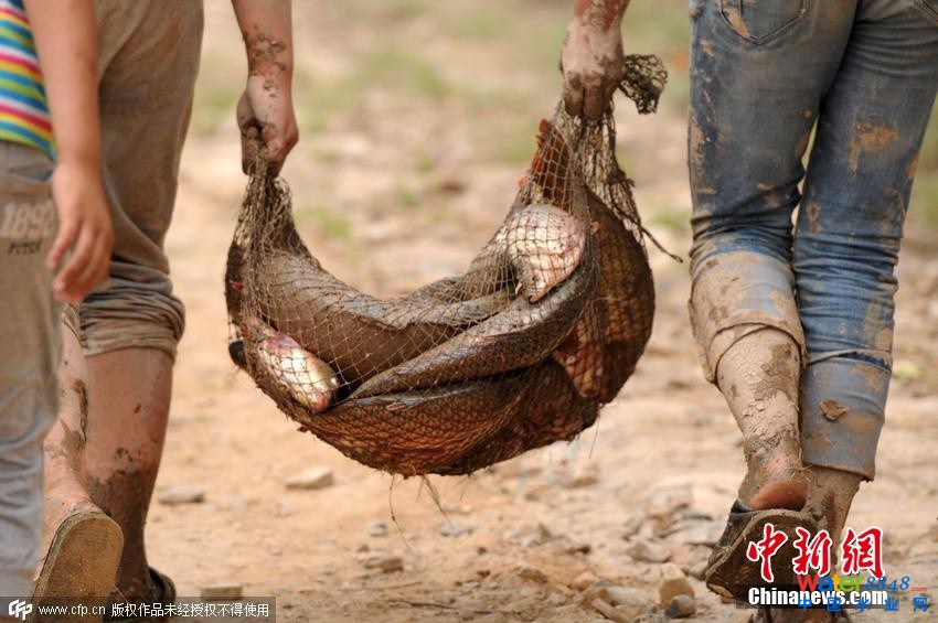 圖為一名群眾背著撈到的魚上岸。 劉寶成 攝 圖片來源:CFP視覺中國