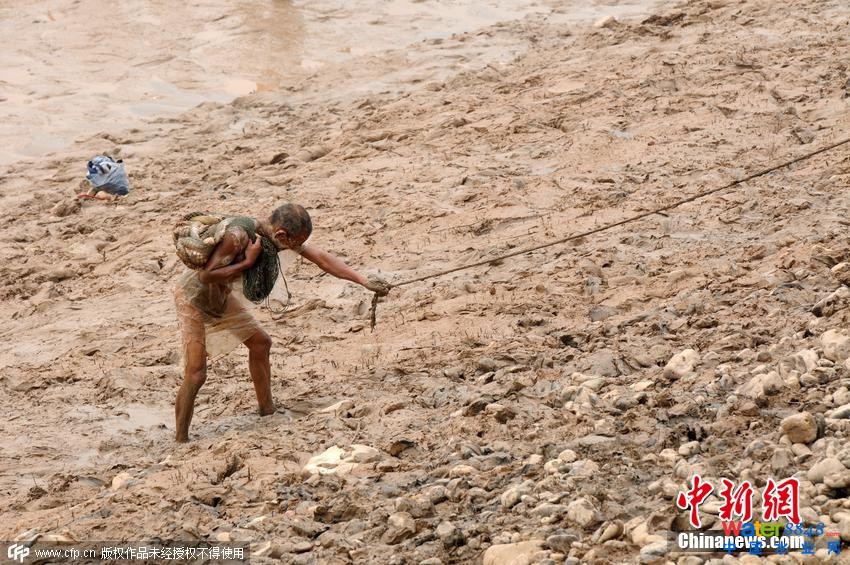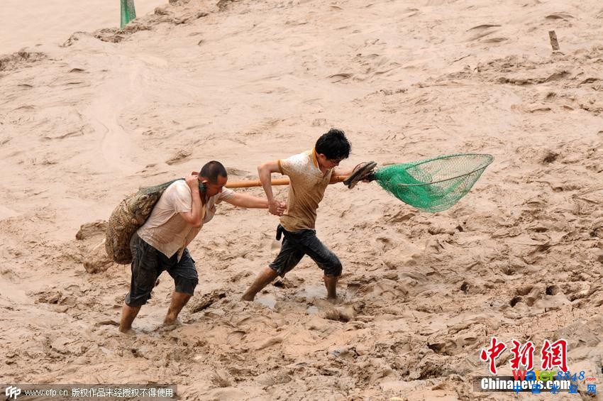 7月9日,山西平陸,近日,三門峽水庫開閘泄洪,黃河出現(xiàn)流魚現(xiàn)象,二十余公里的黃河兩岸,幾千名沿河百姓紛紛涌到岸邊灘涂上用漁具冒險(xiǎn)撈魚,場面蔚為壯觀。據(jù)了解,每年三門峽水利樞紐調(diào)水調(diào)沙期間,由于黃河主河道泥沙大,水流急,水中供氧不足,導(dǎo)致魚兒翻出水面,形成“流魚’奇觀。圖為兩名群眾背著撈到的魚上岸。 劉寶成 攝 圖片來源:CFP視覺中國
