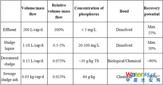 表4闡述了以上四種物質(zhì)中可回收的磷的濃度和回收率。如果污水處理工藝沒有生物或者化學(xué)除磷環(huán)節(jié),出水中磷的回收率將高達(dá)55%,只有采用了生物或者化學(xué)除磷工藝,才會(huì)在污泥或者污泥回流液中得到較高的磷回收率。