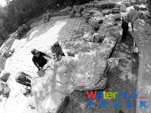 香山公園工作人員利用晴天,對(duì)集雨工程進(jìn)行整修。