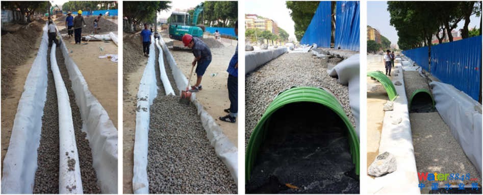 (3)雨水調(diào)蓄儲(chǔ)存:位于下沉式綠地以下,不占用上部土地空間,路面及綠化雨水均進(jìn)入調(diào)蓄系統(tǒng)。