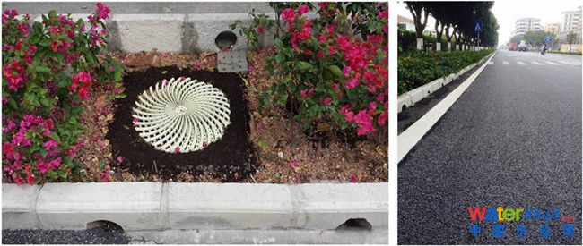 (2)隔離帶:下沉式綠地,自然滲透以外的部分通過(guò)雨水篦子進(jìn)入調(diào)蓄系統(tǒng)。