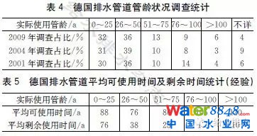 德國自1984年開始對排水管道狀況進(jìn)行全面的調(diào)查,1995年后形成了3年進(jìn)行1次調(diào)查的制度。2004年開始大力推進(jìn)對公共排水管道進(jìn)行電視或者其他光學(xué)檢測。德國水協(xié)(DWA)于2009年對德國公共排水管道情況做了全面總結(jié)和評價,并增加了排水管道的可使用年限和剩余使用年限的評估內(nèi)容。