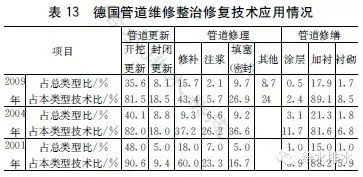 德國將維修整治措施分為修理、修繕和更新3類。其中,修理是指局部小范圍的缺陷排除;修繕是指在完全或者部分利用原始管道材料的情況下,通過措施,改善排水管道當(dāng)前的狀態(tài);更新是指在原管位(包括內(nèi)部)或者另外的位置實施新的排水管道(替代原有排水管道),恢復(fù)排水管道的功能。表13是各種整治工藝技術(shù)的使用情況,在這些整治措施中,管道更新是主要措施,而且以開槽埋管居多。但是與2001年相比,管道更新中封閉更新方法的使用率提高了近1倍。