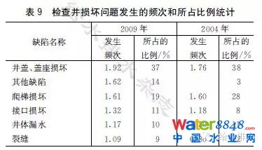 檢查井的缺陷情況與以往調(diào)查相似,發(fā)生頻次和所占比例最高的缺陷仍然是井蓋和蓋座損壞,其次是爬梯的損壞和管道與檢查井的銜接,具體見表9。