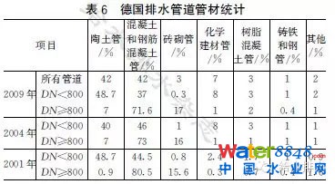 德國排水管道管材統(tǒng)計見表6,可以看出,德國排水管道主要是以陶土管、混凝土/鋼筋混凝土管為主,近年來,盡管樹脂混凝土管和化學(xué)建材(塑料、玻璃纖維)管道使用量有所增加,但是其所占比例仍然很小。