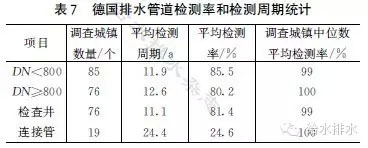 為了更加有效掌握排水管道實際狀況和各類缺陷情況。德國大力推進(jìn)電視、聲納等檢測手段的使用,80%以上的排水管道已進(jìn)行過電視或者其他光學(xué)方法的檢測,公共排水管道(渠)及檢查井的檢測周期平均為12a,德國排水管道檢測率和檢測周期統(tǒng)計見表7。