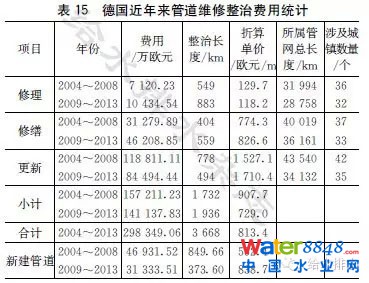 從表12得知,德國有17%的管道設(shè)施處在0~2的級別中,也就是說這些管道設(shè)施需要在近、中期內(nèi)整治修復(fù)。按照2009~2013年調(diào)查,平均整治每米管道需要729歐元,則17%的管道整治需要669億歐元。