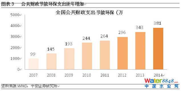 據(jù)平安證券研究中心報告,“十三五”期間節(jié)能環(huán)保方面的投入可能將是“十二五”期間的兩倍以上,且國家在未來十三五期間將針對水資源和大氣資源的環(huán)保領域投入更多的資金。