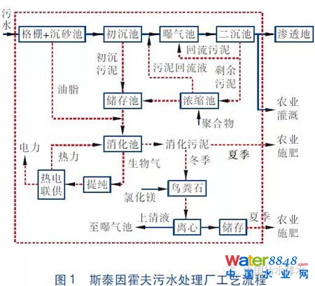 斯泰因霍夫污水廠自1954年投入運行以來,因其在可持續(xù)發(fā)展方面的成功示范,目前已被看作一個能量與資源回收的成功案例。剩余污泥是該廠能源回收注意力的焦點,通過厭氧消化產(chǎn)甲烷方式實現(xiàn)污水中蘊含能量的回收。為提高污泥厭氧消化CH4生成量,該廠對污泥首先進(jìn)行了熱解預(yù)處理,并在厭氧消化過程中通過投加額外有機(jī)質(zhì)來強化CH4生成。此外,該廠還充分利用污水中的氮、磷資源與水資源,將處理出水和污泥通過泵站與管道系統(tǒng)輸送至農(nóng)田,為約3000hm2農(nóng)作物提供養(yǎng)分及灌溉用水,可大大節(jié)省因灌溉抽取地下/地表水和生產(chǎn)化肥所導(dǎo)致的能耗并相應(yīng)減少CO2排放。