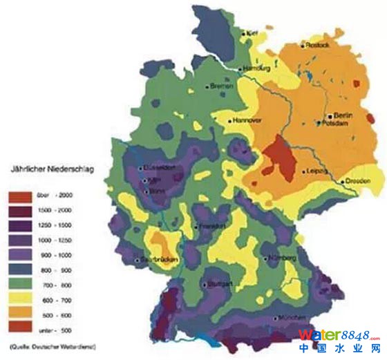 德國境內全年平均降水大約為800mm。降水分布圖見圖2,由圖可知,全年降水分布比較不均,從400mm到2500mm均有分布。并且,從德國西部向東部區(qū)域,降水逐漸減少,并且夏季比冬季降水偏多,因此夏季會更加濕潤?傮w而言,德國是一個擁有充足水資源的國家,農(nóng)業(yè)灌溉主要依靠自然降水,不需再添加其他澆灌措施。