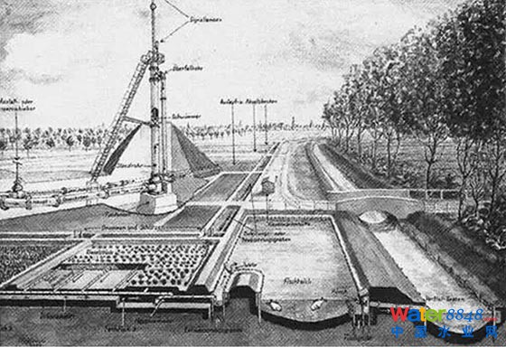 污水處理真正開始于19世紀末期,最開始的污水處理只是一些簡單的機械式過濾,比如格柵、沉砂池和沉淀池。同時,在柏林,“自然”生物處理法也開始逐漸產(chǎn)生。污水首先經(jīng)過機械式預處理,然后被泵送入所謂的“Rieselfelder”(污水田),如圖3所示。這種自然生物處理法是比較節(jié)能的,有機物和所有的營養(yǎng)物都可以被利用。但是這種方法的占地面積非常大并且會使土地發(fā)生鹽堿化。