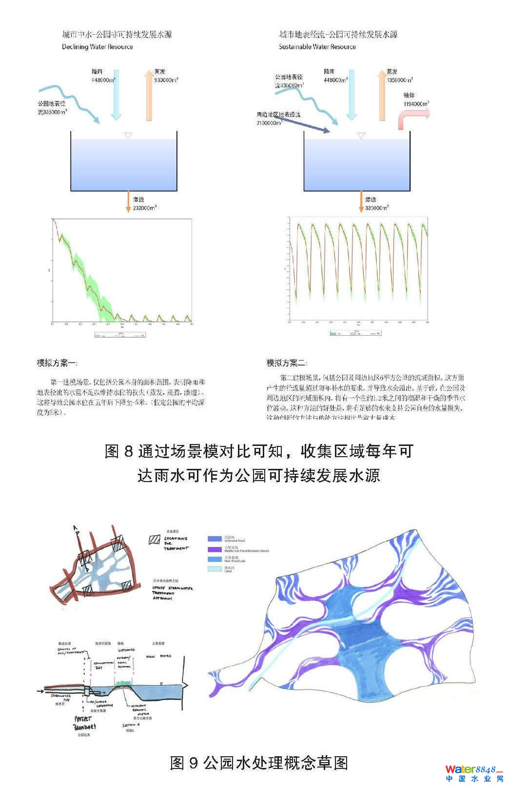 公園地勢低洼,南北各有超過6平方公里的建設(shè)區(qū),并且都有雨水管通向公園。公園正是設(shè)置中央雨水收集區(qū)的理想位置。項目區(qū)北部和南部的雨水下水道系統(tǒng)(非污水)負(fù)責(zé)收集城市化鄰近地塊的雨水排人公園集水池,作為待處理的景觀用水。根據(jù)兩套方案模擬測算,公園周邊雨水收集后,足以滿足公園景觀用水量。(圖7, 8 )