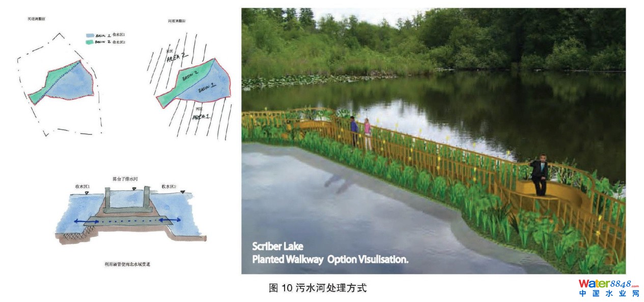 通過局部調(diào)整園內(nèi)排水河的位置,在不影響排水功能的前提條件下,將公園水體劃定為處理能力相近的雨水收集區(qū)。通過在排水河下設(shè)置的地下涌管聯(lián)將南北水體貫通,從而使東西水面保持一致的水位。為了避免雨季排污河道系統(tǒng)的特殊氣味,設(shè)計建議采用積極的處理措施,如設(shè)計為漂浮型濕地,既減少了污水河對公園環(huán)境的影響,同時可以提升公園的親水性和趣味性。(圖10)