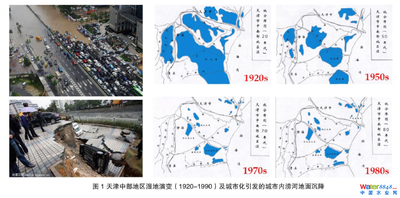 城市化使主要景觀的濕地區(qū)域填充化、破碎化,進(jìn)而導(dǎo)致本地植被消失、水質(zhì)惡化、生態(tài)多樣性弱化,濕地面積從20世紀(jì)初的45.9%銳減至21世紀(jì)初的14.5%m。開發(fā)范圍和速度日益提升、自然水資源的相應(yīng)萎縮對天津的濕地造成根本性破壞同時,城市不斷膨脹的人口導(dǎo)致相應(yīng)的用水需求大幅增加,也造成水資源總體匱乏。這一問題不僅源于天津自身用水需求、降水量稀少,而且源于其地處首都北京供水系統(tǒng)的下游末端。由于城市長期面臨缺水導(dǎo)致地下水長期超采,進(jìn)而引發(fā)區(qū)域性水位下降,地面沉降等次生災(zāi)害。簡言之,天津處于嚴(yán)重的水危機(jī)之中。(圖l)