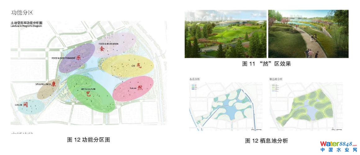 公園設(shè)計依托周邊的城市社區(qū)和文教機(jī)構(gòu),打造成為匯集休閑、文化、商業(yè)、科普等功能組成的綜合性活力區(qū)域。這使得公園不僅是聯(lián)通城市內(nèi)部與外部綠色走廊系統(tǒng)的匯合點,也是集休閑、娛樂和美景于一身的公共活動目的地。公園內(nèi)由若干島嶼組成,劃分為閑、康、藝、然、氣、食、樂七個主題區(qū)域,滿足不同人群休閑康體親近自然和餐飲娛樂等活動的需