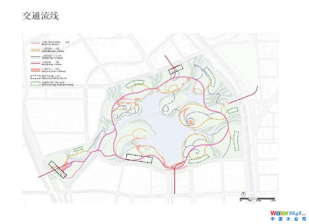 公園毗鄰?fù)猸h(huán)線及快速路及主干路,對外交通便利。但僅僅考慮小汽車作為單一交通方.式已不是現(xiàn)代城市交通發(fā)展趨勢。如何借助城市公交,地鐵及慢行等交通方式,提升公園可達(dá)性,強(qiáng)化其“公共生活目的地“的定位,也是必須考慮的問題。