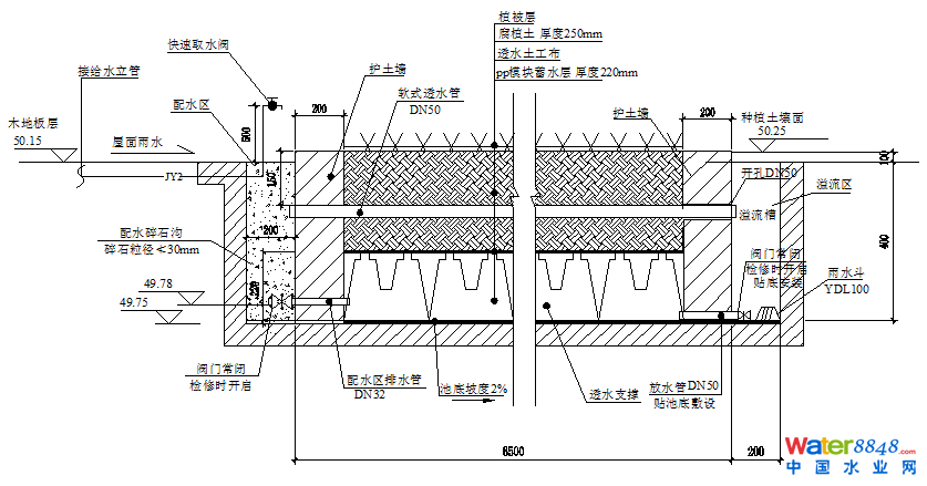 本工程采用屋頂人工濕地,主要用于凈化屋頂雨水,可達(dá)到雨水回收凈化,屋面綠化等效果,屋頂人工濕地剖面示意圖如下: