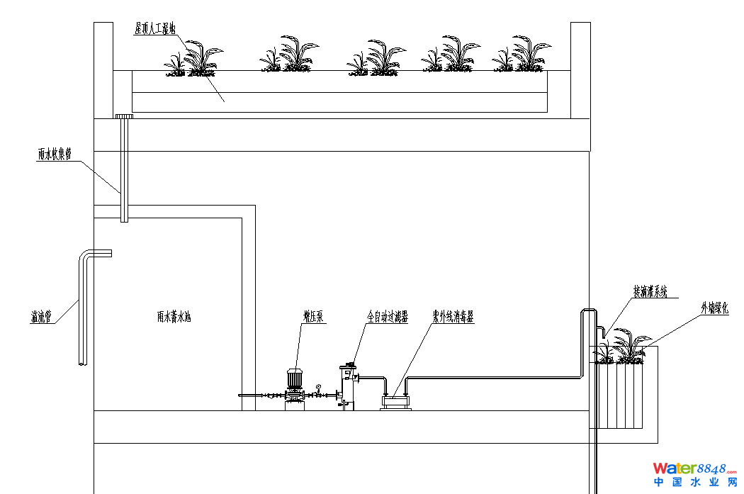 本項目雨水收集屋面人工濕地溢流水,雨水經(jīng)人工濕地初步過濾后進(jìn)入到下層雨水收集池。