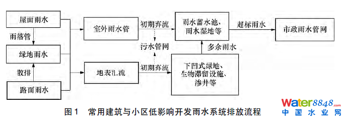 常用建筑與小區(qū)低影響開發(fā)雨水系統(tǒng)排放流程如圖 1 所示。