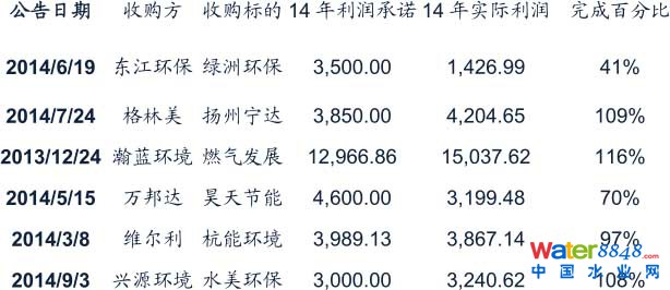 標(biāo)的資產(chǎn)盈利承諾的完成情況反映了標(biāo)的資產(chǎn)的質(zhì)量及并購后的整合情況,若行業(yè)內(nèi)普遍存在利潤承諾完成低于預(yù)期的情況,則反映出行業(yè)存在盲目并購(并購標(biāo)的質(zhì)量欠佳)或標(biāo)的行業(yè)出現(xiàn)盈利下滑。從環(huán)保板塊14年收購標(biāo)的利潤承諾完成情況來看,并購標(biāo)的利潤承諾完成較好,行業(yè)并購處于良性發(fā)展態(tài)勢。