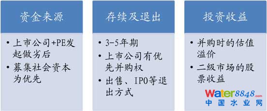 產(chǎn)業(yè)并購基金實(shí)現(xiàn)實(shí)現(xiàn)“三贏”。對于上市公司來講,彌補(bǔ)項(xiàng)目資源不足、控制并購風(fēng)險、提升并購效率;對于PE來講,有較確定的退出途徑;對于社會資本來講,獲取優(yōu)先級的回報。因環(huán)保領(lǐng)域并購基金興起較晚,目前尚無成熟的投資案例。
