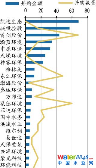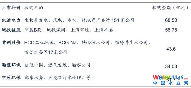 分公司來看,并購金額前五名分別是凱迪電力、城投控股、首創(chuàng)股份、中原環(huán)保、瀚藍(lán)環(huán)境,其收購金額占總金額的56%。