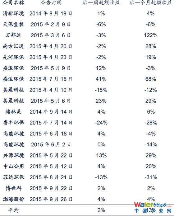 我們對環(huán)保公司設(shè)立并購基金后的股價表現(xiàn)的進(jìn)行了統(tǒng)計,發(fā)現(xiàn)其在公告設(shè)立并購基金一個月內(nèi)的平均獲得13%的超額收益,設(shè)立并購基金對股價有一定的提振作用。