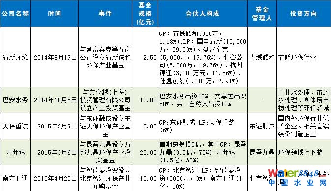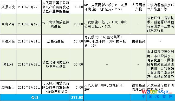 據(jù)我們統(tǒng)計,自2014年下半年以來,15家環(huán)保行業(yè)上市公司與各類投資公司成立產(chǎn)業(yè)并購基金,總規(guī)模達(dá)263億元,投資領(lǐng)域涉及固廢、水處理、節(jié)能、大氣治理等環(huán)保多個領(lǐng)域。