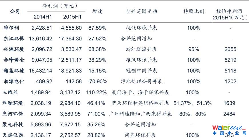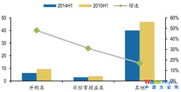 環(huán)保板塊收入增速20.7%、利潤(rùn)增速30.6%,收入、業(yè)績(jī)?cè)鏊倬佑谛袠I(yè)前列,其中并購(gòu)顯著提升業(yè)績(jī)。我們統(tǒng)計(jì)范圍內(nèi)的56家環(huán)保公司中報(bào)顯示,共有12家環(huán)保公司2015年上半年同比出現(xiàn)合并范圍增加(還有部分并購(gòu)標(biāo)的尚未并表),12家環(huán)保公司整體凈利潤(rùn)增速高達(dá)48%,而其他公司整體凈利潤(rùn)增速僅為17%?梢姡①(gòu)正在成為環(huán)保公司業(yè)績(jī)?cè)鲩L(zhǎng)的重要驅(qū)動(dòng)因素。