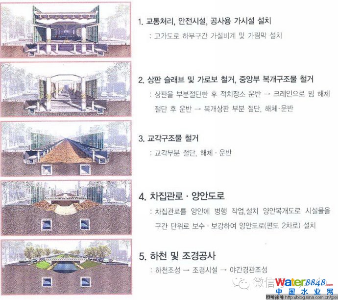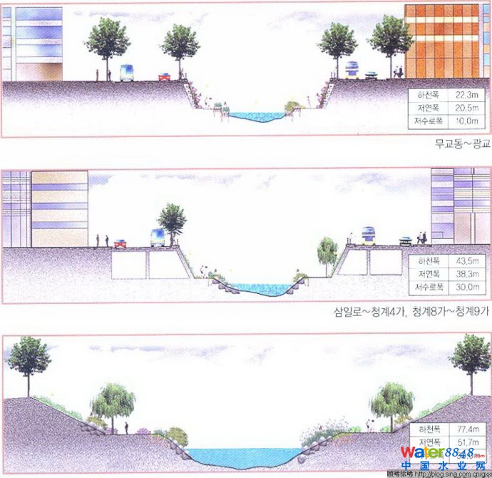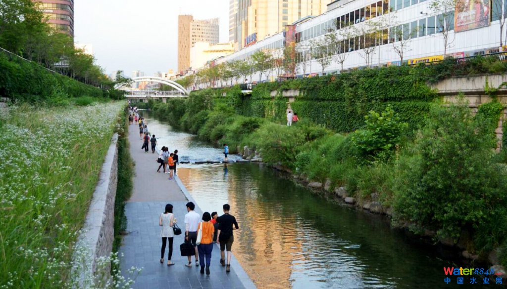 1.修復(fù)水體。一是解決水源。由于難以恢復(fù)歷史上的天然水系,為保證清溪川不斷流,最終利用經(jīng)處理的漢江水、地下水和雨水、中水向清溪川河道提供水源。二是設(shè)置獨立的污水系統(tǒng)。清溪川被覆蓋在地下時承載著排污的功能,為防止復(fù)原的水體重新被污染,建設(shè)了新的獨立的污水系統(tǒng),對流入清溪川的生活污水進行隔離處理。