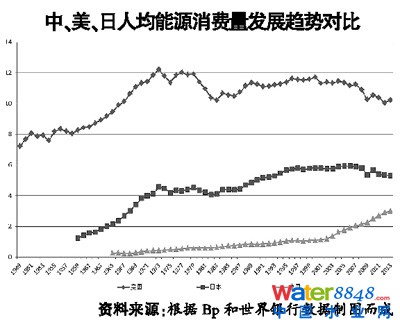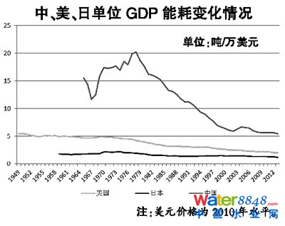 近些年我國(guó)單位GDP能耗保持下降趨勢(shì),2013年降至0.81噸標(biāo)準(zhǔn)煤/萬(wàn)元(2010年價(jià)格)。但下降速度較為緩慢,近十年年均下降1.4%,目前我國(guó)單位GDP能耗是世界平均水平的2.5倍,美國(guó)的3.3倍,日本的7倍,下降空間仍然很大。
