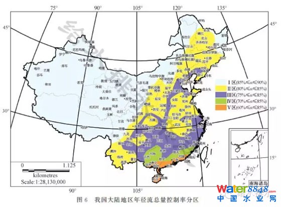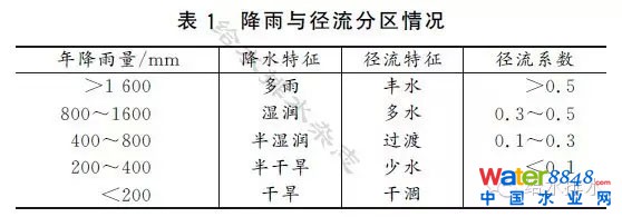 徑流系數(shù)是表征水文特征的重要參數(shù),是自然狀態(tài)下地表徑流量與總降雨量的比值,與自然地理氣候狀況有直接關(guān)系。依據(jù)多年水文氣象資料,我國降雨-徑流分布規(guī)律可劃分為5個區(qū)(如表1和圖3所示),大致反映了各個區(qū)域的自然水文生態(tài)特征。