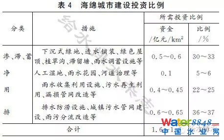 綜合各地已開展的低影響開發(fā)建設(shè)項目的實踐,估算海綿城市建設(shè)投資為1.6~1.8億元/km2,見表4。