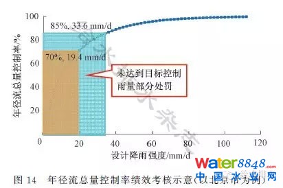 將年徑流總量控制率、水環(huán)境質(zhì)量狀況、排水防澇標(biāo)準(zhǔn)、污水再生利用及雨水利用、漏損控制等作為海綿城市建設(shè)的績效考核目標(biāo),考核結(jié)果可作為財政獎補的依據(jù)。以年徑流總量控制率對應(yīng)的降雨強度作為地塊徑流控制是否達(dá)標(biāo)的衡量標(biāo)準(zhǔn),通過區(qū)域總排口的連續(xù)監(jiān)測,對于未達(dá)到目標(biāo)控制雨量的部分進(jìn)行處罰(如圖14所示)。此外,不同考核地塊之間,也可研究建立年徑流控制量的平衡和交易機(jī)制,鼓勵公平分擔(dān)、獎優(yōu)罰劣。
