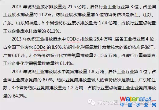 2008年紡織工業(yè)廢水排放量23億噸,居各行業(yè)工業(yè)行業(yè)第3位,占全國工業(yè)廢水排放量的10.60%。紡織工業(yè)排放廢水中CODcr排放量31.4萬噸,居各工業(yè)行業(yè)第4位,占全國工業(yè)廢水CODcr的7.76%。