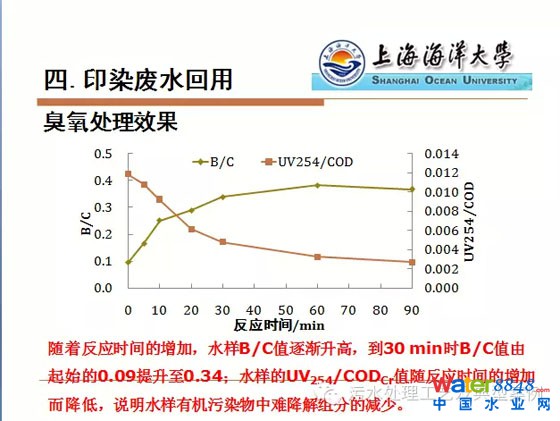 研究了B/C和UV254/COD,從圖中可看出,隨反應(yīng)時間增加,B/C值逐漸升高,到30min時B/C值由起始的0.09提升至0.34,水樣的UV254/COD值隨反應(yīng)時間增加而降低,UV254代表水中難降解組分,說明隨時間增加,水中難降解有機物減少很多。