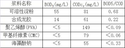 漿料目前常用的是這五種,最常用的兩種:聚乙烯醇和可溶性淀粉,聚乙烯醇的B/C特別低,實際情況可能0.01都不到,可生化性特別差。