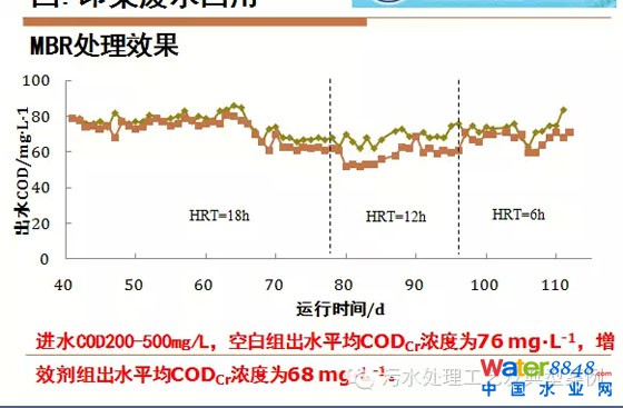 MBR分了兩組,一組傳統(tǒng)的MBR,一組加了自己做的增效劑,主要是抗污染,也對MBR處理效果有稍微提高。進(jìn)水COD200-500mg/L,空白組出水平均76mg/L,增效劑組出水平均68mg/L(做了100多天的試驗)。
