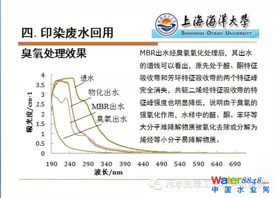 對臭氧出水做了紫外全分析(190-690nm),MBR出水經(jīng)臭氧氧化處理后,原先的醛、酮、芳環(huán)特征峰全部消失,共軛二烯烴的特征峰也有明顯降低,說明臭氧的強氧化作用使水樣的醛、酮、芳環(huán)等難降解物質(zhì)被降解。