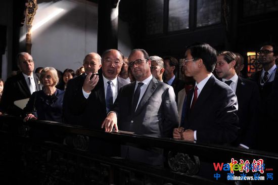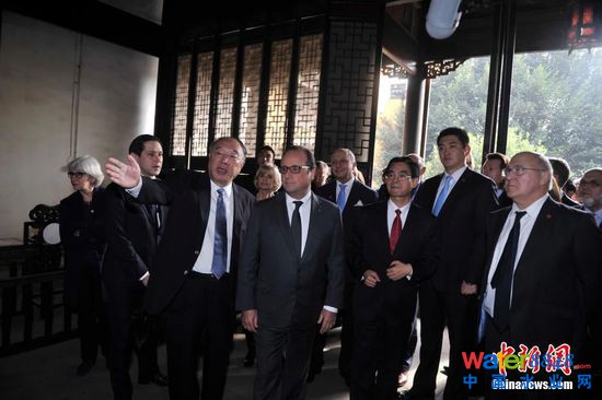 11月2日,法國總統(tǒng)弗朗索瓦·奧朗德專機抵達重慶開啟他對中國的第二次國事訪問。此次亦是奧朗德首次正式訪問重慶,并有官方代表團、文化界人士、企業(yè)家隨行。奧朗德在重慶市長黃奇帆的陪同下,先后參觀了重慶中法唐家沱污水處理廠和湖廣會館,了解重慶經(jīng)濟社會和文化發(fā)展情況。圖為重慶市長黃奇帆正在為法國總統(tǒng)奧朗德介紹湖廣會館情況。 中新社記者 陳超 攝