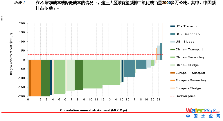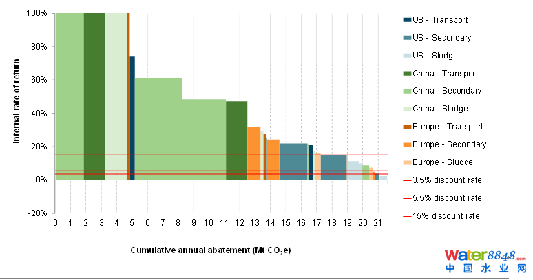 三大核心地區(qū)綜合邊際減排成本曲線表明,成本最高和最低的減排方案均是關(guān)于污水輸送和二級(jí)處理。從地域上來看,中國的減排量最高。這說明中國污水處理能力較強(qiáng),污水處理量也在不斷上升,且其電力供應(yīng)屬于排放密集型行業(yè)。這三大地區(qū)均實(shí)現(xiàn)了降低成本的減排,但是歐洲和中國減排成本要低于美國。這是因?yàn)槊绹妰r(jià)相對(duì)較低,減少了因降低用電量所產(chǎn)生的財(cái)務(wù)效益。