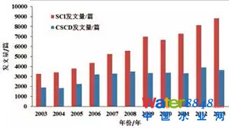 其次,高校功利評(píng)估價(jià)值觀的錯(cuò)誤引導(dǎo)。目前國(guó)內(nèi)大學(xué)普遍對(duì)教師使用的科學(xué)評(píng)價(jià)指標(biāo)包括研究經(jīng)費(fèi)、國(guó)際SCI論文發(fā)表和SCI 雜志影響力,尤其是SCI 論文發(fā)表已成為教師職業(yè)發(fā)展、晉升的主要價(jià)值取向,這長(zhǎng)期控制和影響著教師的學(xué)術(shù)活動(dòng),使教師熱衷于“申請(qǐng)課題、開展研究、發(fā)表SCI 論文(申請(qǐng)專利)、通過評(píng)審、再申請(qǐng)課題”的循環(huán)。一些年富力強(qiáng)的中年教師本應(yīng)該將積累的科研成果產(chǎn)業(yè)化,而迫于評(píng)價(jià)指標(biāo)的壓力,而不得不“武松拿起了繡花針”,舍棄對(duì)研究成果轉(zhuǎn)化的追求轉(zhuǎn)為追逐SCI 論文的發(fā)表。圖一是2003-2013 年國(guó)內(nèi)環(huán)境保護(hù)領(lǐng)域發(fā)表學(xué)術(shù)論文變化統(tǒng)計(jì)數(shù)據(jù),可以看出,環(huán)保領(lǐng)域近十年的國(guó)內(nèi)學(xué)術(shù)論文增長(zhǎng)迅速,已成為國(guó)際環(huán)保領(lǐng)域一支重要的研究隊(duì)伍。