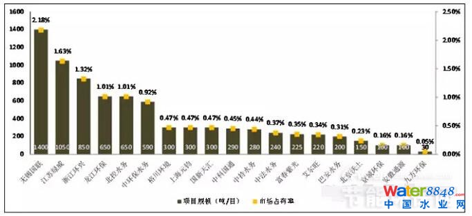 導(dǎo)讀: 通過(guò)對(duì)市政領(lǐng)域污泥項(xiàng)目進(jìn)行統(tǒng)計(jì),通過(guò)企業(yè)反饋和信息搜集等途徑,對(duì)污泥企業(yè)進(jìn)行盤(pán)點(diǎn),據(jù)不完全統(tǒng)計(jì),截止2015年10月,各企業(yè)已運(yùn)營(yíng)的BOT、BOO、DBO、投資運(yùn)營(yíng)類項(xiàng)目處理規(guī)模如下圖所示。無(wú)錫國(guó)聯(lián)、江蘇綠威和浙江環(huán)興分別以2.18%、1.63%和1.32%的市場(chǎng)占有率位居榜單前3名。