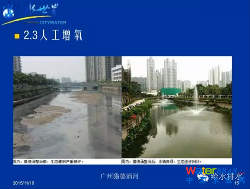 圖2是廣州的獵德涌河,在治理之前臭不可聞,污染非常嚴(yán)重,經(jīng)過人工增氧的方法進(jìn)行治理,水變清了,黑臭消除了,又明顯改進(jìn)了河道景觀,成為民眾喜愛的休息鍛煉場(chǎng)所。
