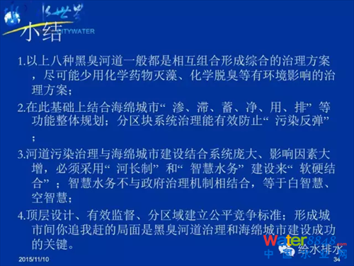 以上八種黑臭河道一般都是相互組合形成綜合的治理方案,盡可能少用化學(xué)藥物滅藻、化學(xué)脫臭等有環(huán)境影響的治理方案。在此基礎(chǔ)上結(jié)合海綿城市“滲、滯、蓄、凈、用、排”等功能整體規(guī)劃,并分雨水流向區(qū)塊系統(tǒng)治理就能夠有效防止“污染反彈”。河道污染治理與海綿城市建設(shè)結(jié)合系統(tǒng)龐大、影響因素大增,必須采用“河長(zhǎng)制”和“智慧水務(wù)”建設(shè)來“軟硬結(jié)合”整體治理,智慧水務(wù)不與實(shí)際污水治理機(jī)制相結(jié)合,等于白智慧、空智慧。頂層設(shè)計(jì),有效監(jiān)督,分區(qū)域建立公平競(jìng)爭(zhēng)標(biāo)準(zhǔn),形成城市間你追我趕的局面是黑臭河道治理和海綿城市協(xié)同治理成功的關(guān)鍵。