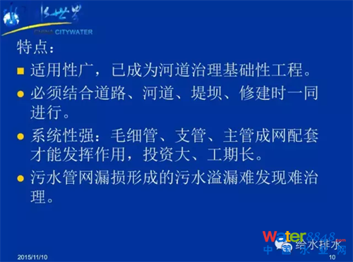 截污納管的特點(diǎn)是:適用性廣,已成為河道治理基礎(chǔ)性工程;但必須結(jié)合道路、河道、堤壩、修建時(shí)一同進(jìn)行;系統(tǒng)性強(qiáng),毛細(xì)管、支管、主管成網(wǎng)配套才能發(fā)揮作用;投資大、工期長(zhǎng);污水管網(wǎng)漏損形成的污水溢漏難發(fā)現(xiàn)、難治理。