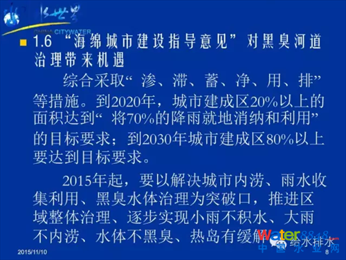 2015年起,要以解決城市內(nèi)澇、雨水收集利用、黑臭水體治理為突破口,推進(jìn)區(qū)域整體治理、逐步實(shí)現(xiàn)小雨不積水、大雨不內(nèi)澇、水體不黑臭、熱島有緩解。
